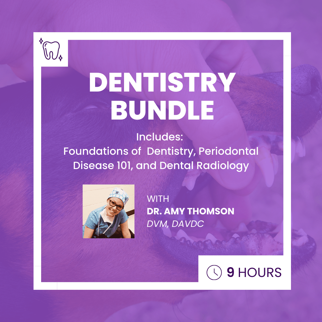 This bundle contains three certificates in veterinary dentistry. From anatomy to examinations to scaling and everything in between, with Dr. Amy Thomson’s quick lessons, you’ll master the foundations of dentistry, periodontal disease and dental radiology.