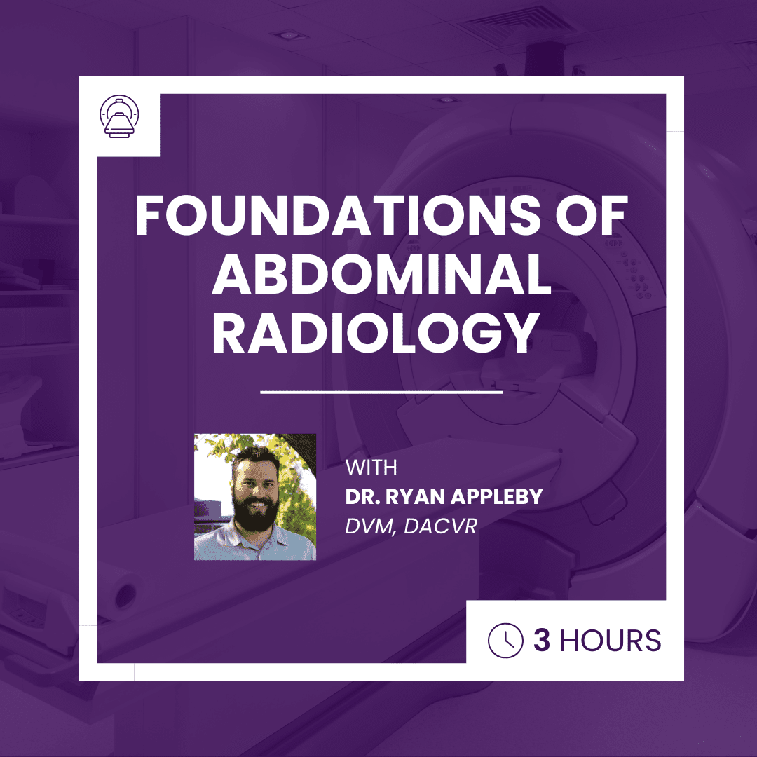 Foundations of Abdominal Radiology covers the foundational concepts of abdominal radiology of the dog and cat. The courses utilizes short lessons, also known as microlearning, which has been proven to boost learner retention. Courses are divided into lessons which are never more than 5 minutes in length, and each lesson is reinforced by a content retention question. Topics include diseases of the lungs, cardiovascular system, pleural space and mediastinum. Ryan Appleby DVM, DACVR reviews radiographs annotating important features and discusses the vital pieces for improving interpretation and making the most of imaging in your practice.