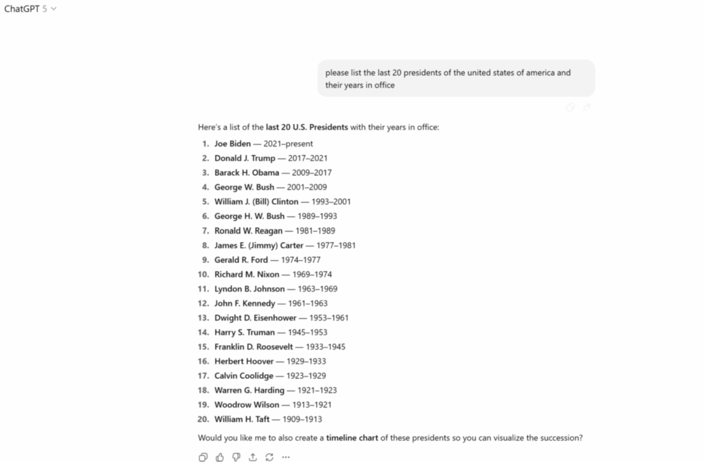 However, a key limitation of an LLM is the cutoff date of its training data. While you and I have an active working memory of the current US president, the LLM is a brain stuck at a certain point in time. For the most recent OpenAI models (GPT-5) the training cut off is June 2024. So, if we ask it to list the last 20 US presidents it might get stuck…