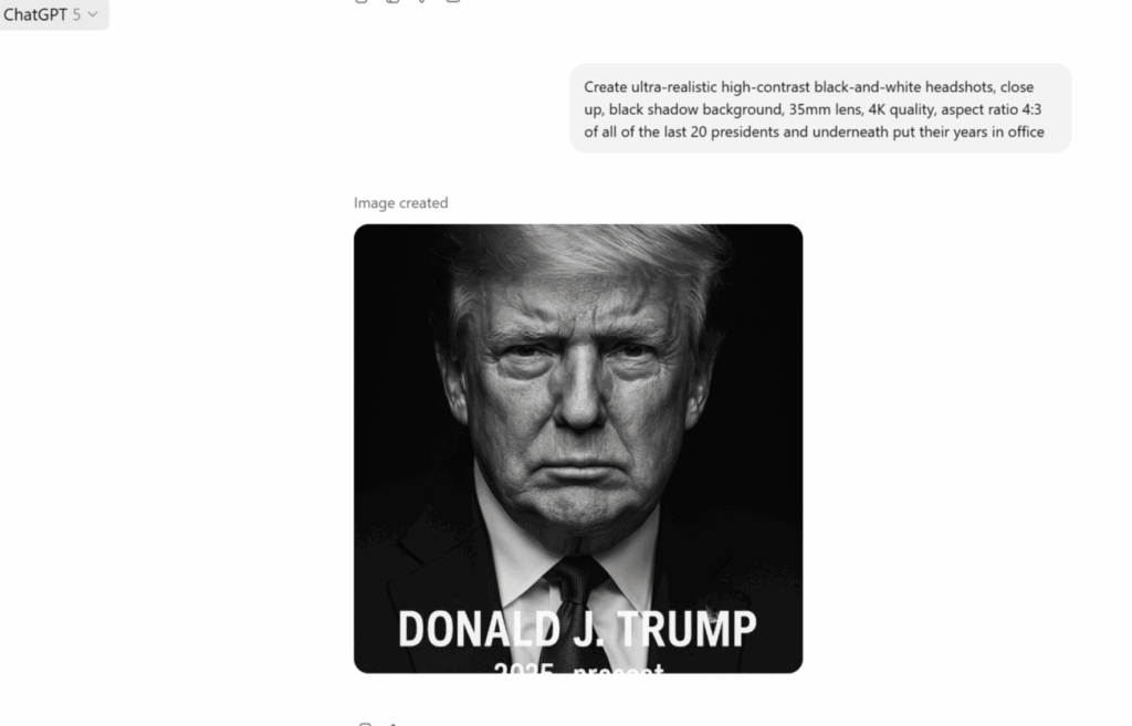 Asking ChatGPT to create an image of presidents in ultra-realistic black and white. Inconsistencies in the tense (asking for a single close up but also 20 of the last presidents) makes the model guess at what we want.