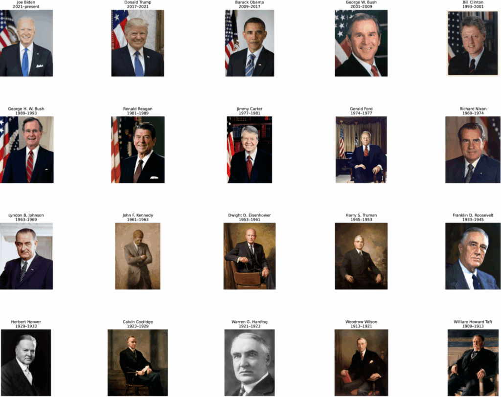 This is the type of model used to create the hilariously inept response my friend shared.  But just as I couldn’t list all the past 20 US presidents, most people also cannot reliably draw from memory the last 20 US presidents.  The issue isn’t with the system, it’s with what you are asking it to do. In the example below, I asked it to create an image of all 20 presidents but asked for a single headshot. It did its best to comply and did a remarkably good job despite the lack of clarity in my prompt.
